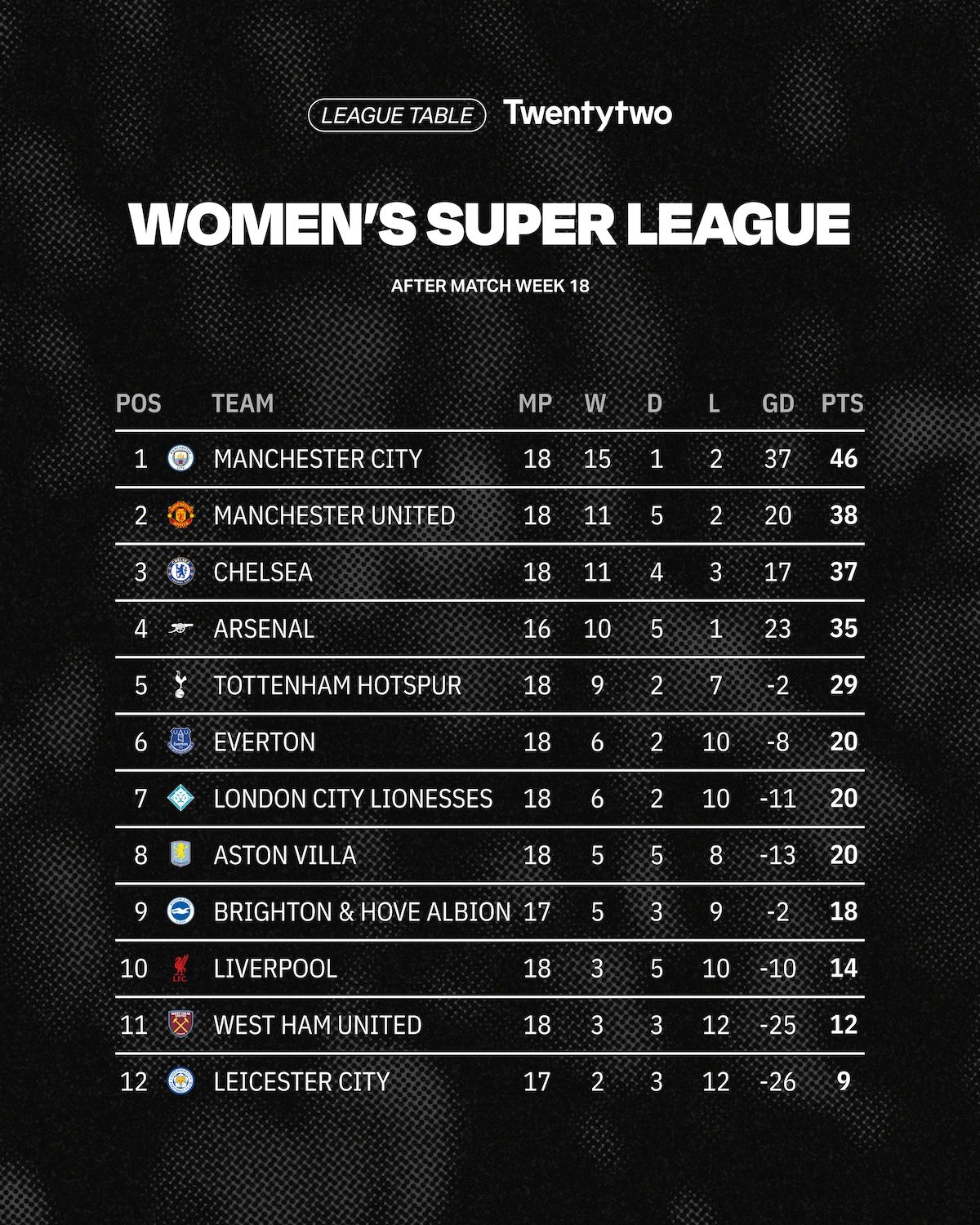 Behind City, things got interesting. United were 90 minutes away from dropping points against Everton before Malard stuck one in at 90+4 to nick it. Chelsea dropped points at London City — Goodwin headed home with eight minutes left to cancel out Rytting Kaneryd's first-half goal. Arsenal, two points off third with two games in hand, are quietly the most interesting team in the top four right now. The European places are up for grabs and it's genuinely anyone's guess how this ends.