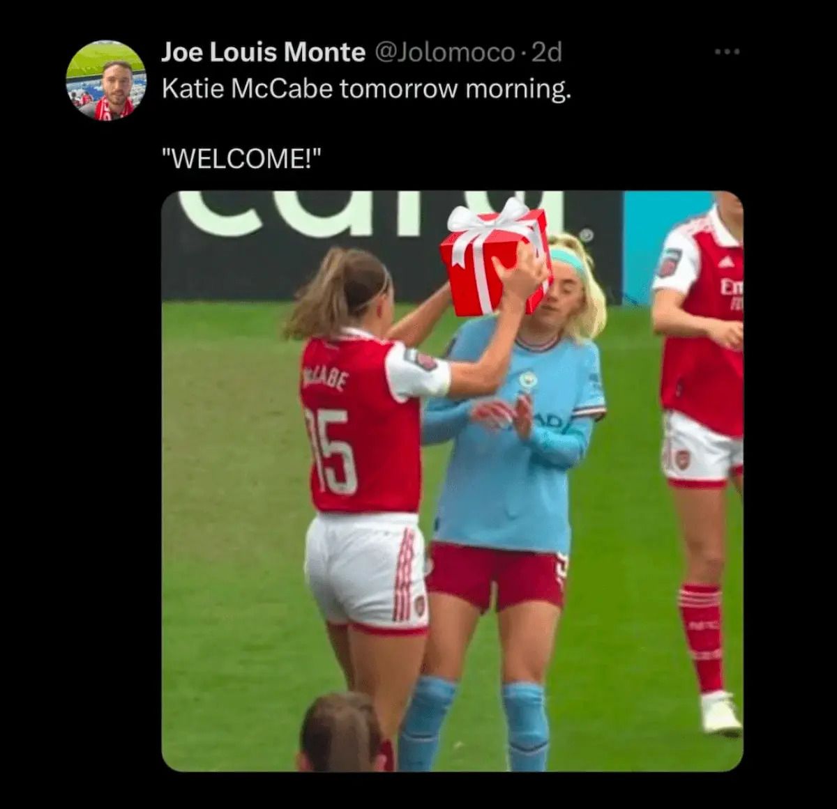 What do you get if you take a historical headloss moment between rivals, a last-minute deadline day loan, and then slap an unhealthy dose of GCSE drama on top? This reenactment of McCabe booshing Chloe Kelly in the head with a ball. Don’t worry, they’re all friends now folks.