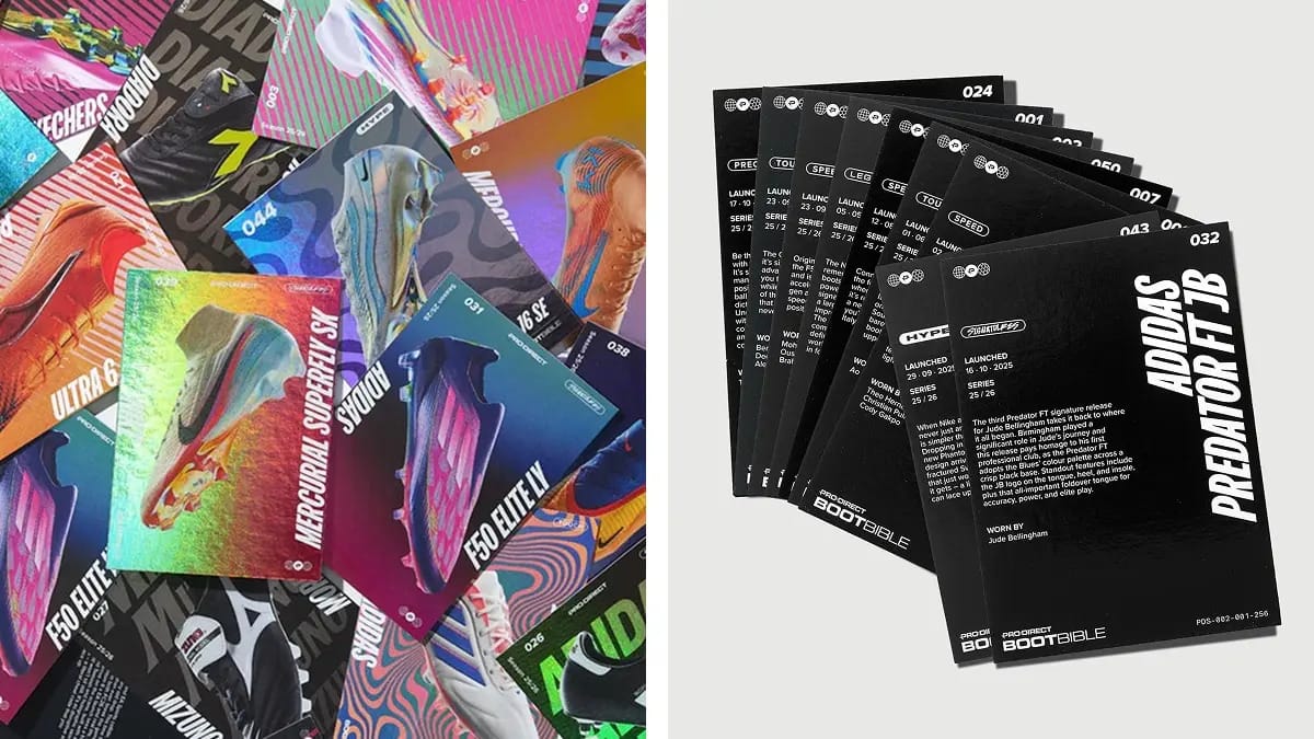 For the football boot nerds and card collectors, Pro:Direct has resurrected its iconic BootBible as trading cards. The 50-card Series 1 packs mix current-season styles with “Legends” and “Hype Drops” and come free with boot orders over £40, or £3 each. Order yours here