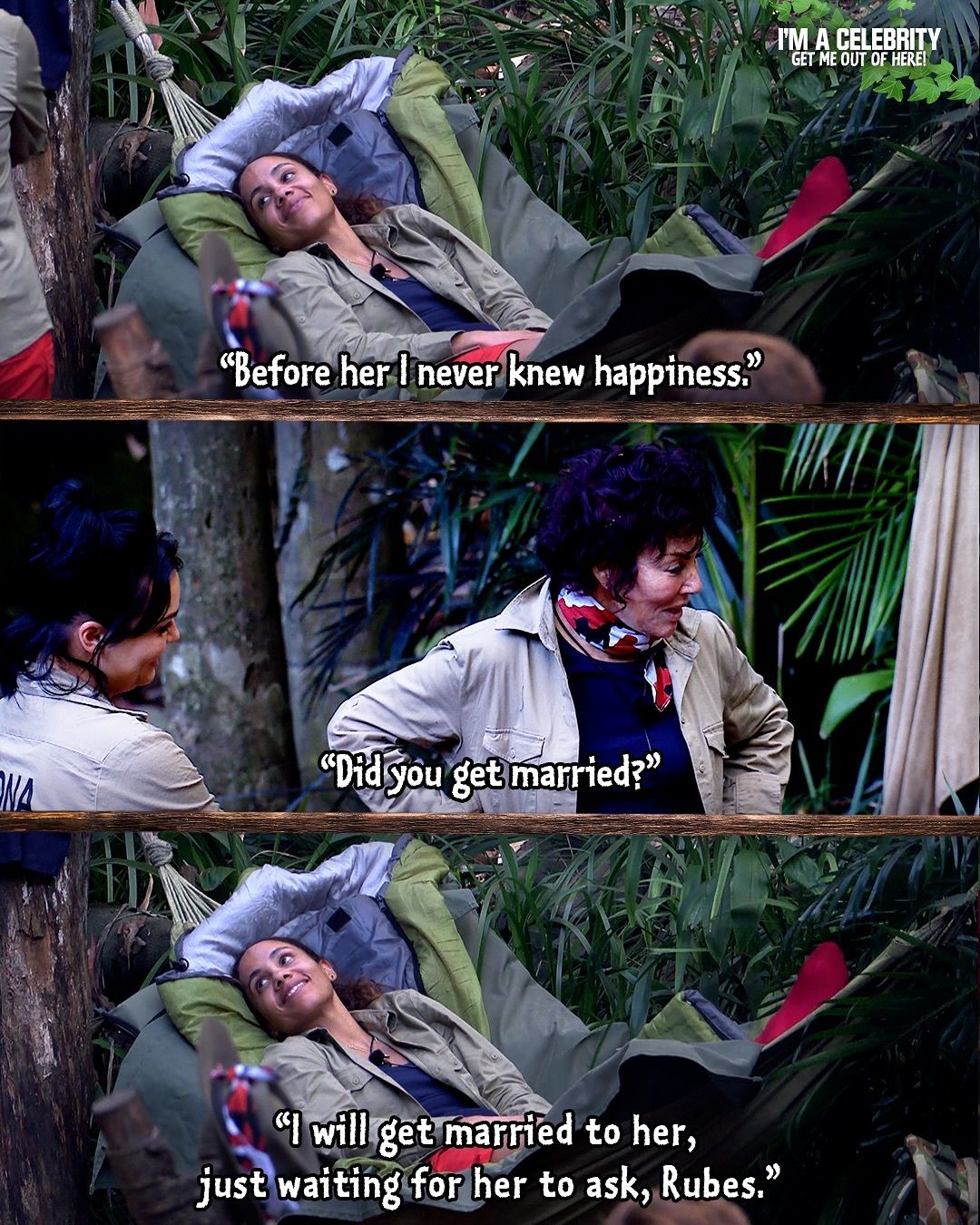 I’m a Celebrity fave moment: Alex Scott talking about her relationship with Jess Glynne, and Ruby Wax hoping for an invite to the wedding. Watch here