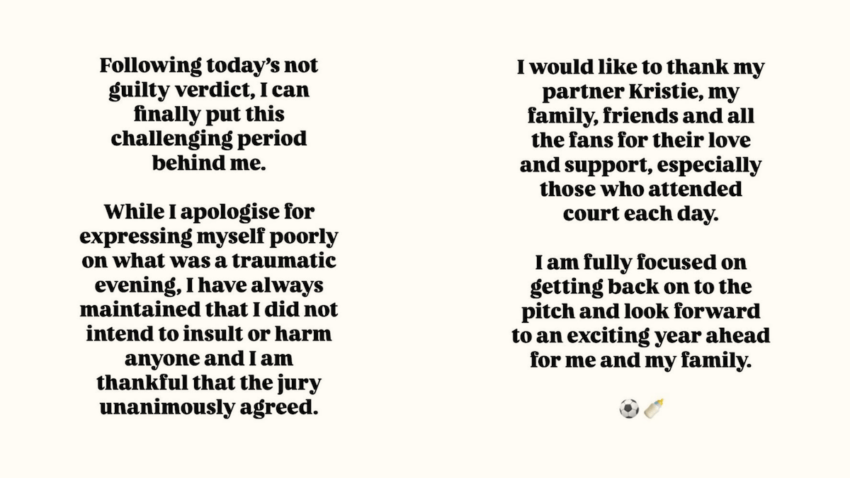 The news dominating the headlines this week was Sam Kerr being cleared after her trial for racially aggravated harassment. For most people, the fact that the case went to trial at all was bonkers. But it did, and the verdict has caused heated debate around free speech and race. Kerr made a statement shortly after the verdict and posted a further comment on Instagram later that day.